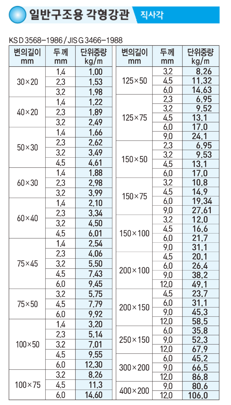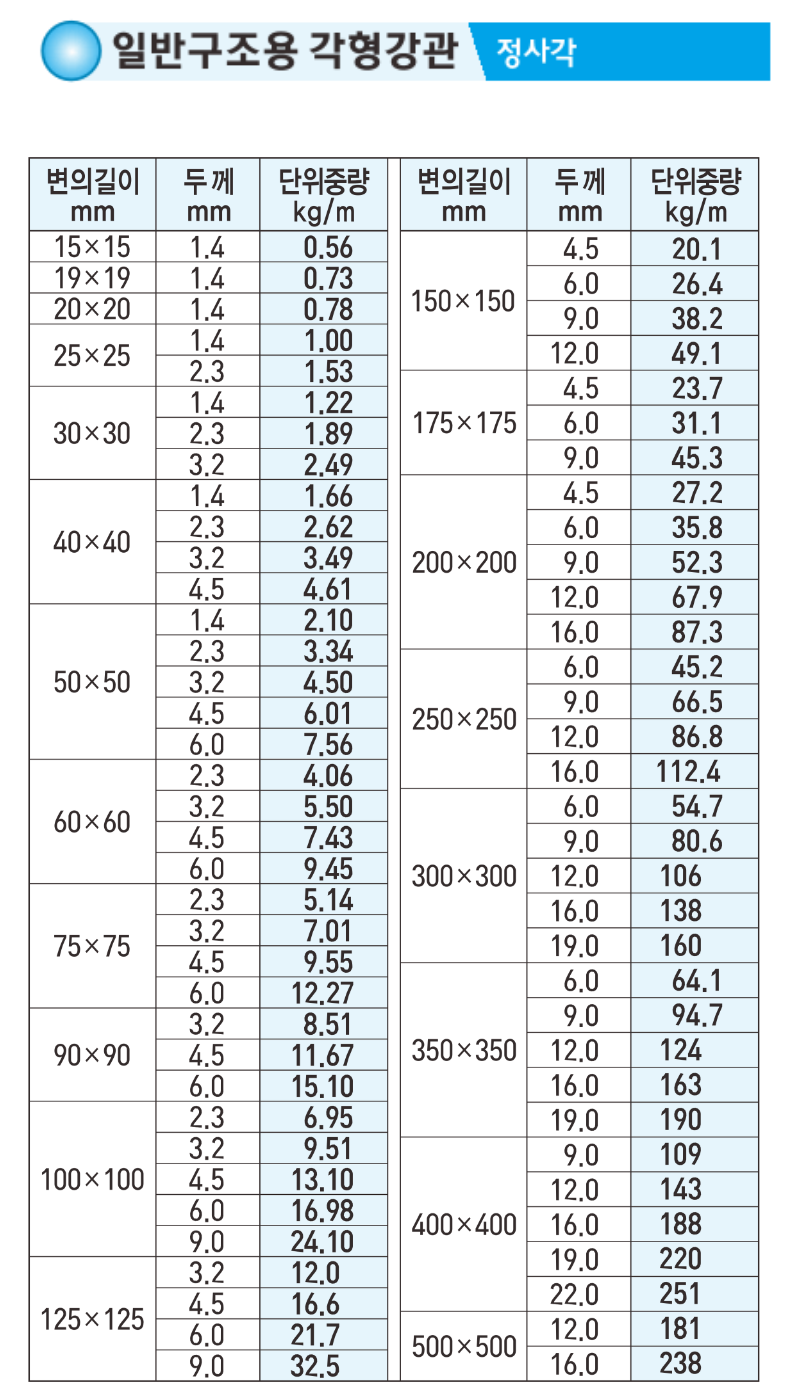 사각형 단면을 가진 강관으로 비틀림과 압축에 강해 구조적 안정성이 뛰어나 건축물 기둥, 프레임, 가구 및 산업 설비에 널리 활용