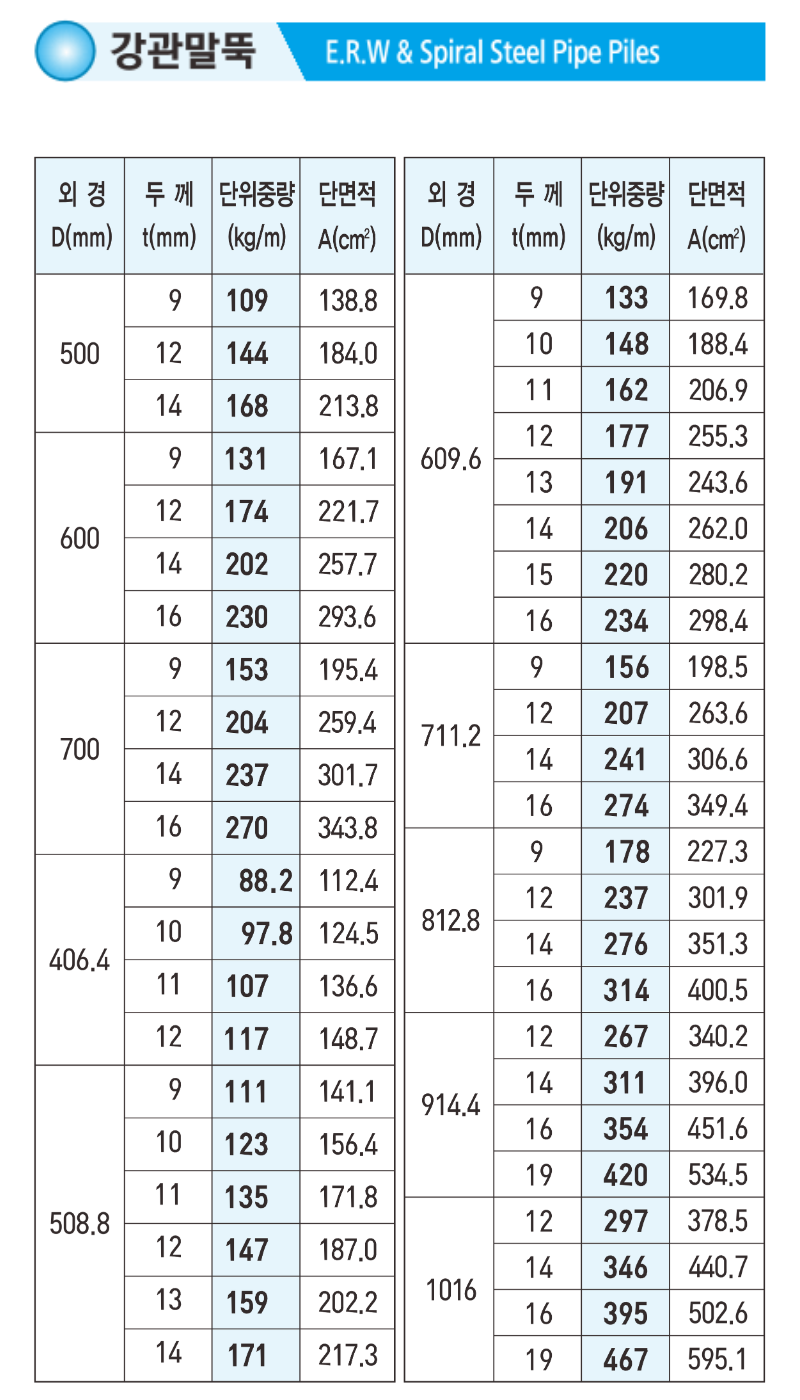 직경이 큰 강재 파이프로 우수한 강도와 내압성을 바탕으로 대규모 구조물에 적합해 교량, 항만, 토목 기초 등 인프라 건설에 널리 활용